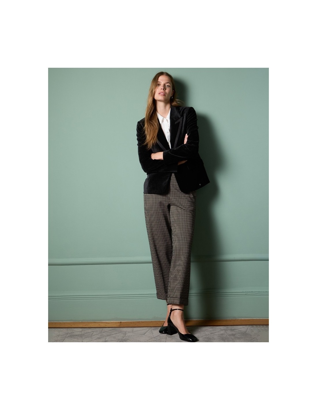 PANTALÓN RECTOY ELÁSTICO EN PATA DE GALLO CON ESTAMPADOS DE ESTILO BRITÁNICO, CIERRE FRONTAL E INVISIBLE