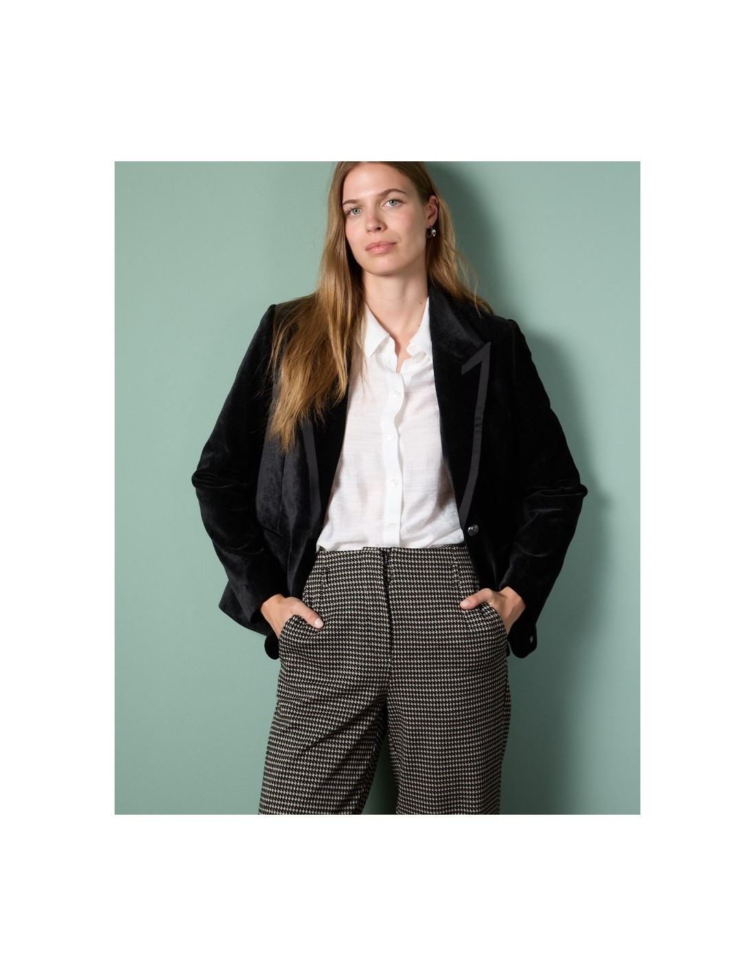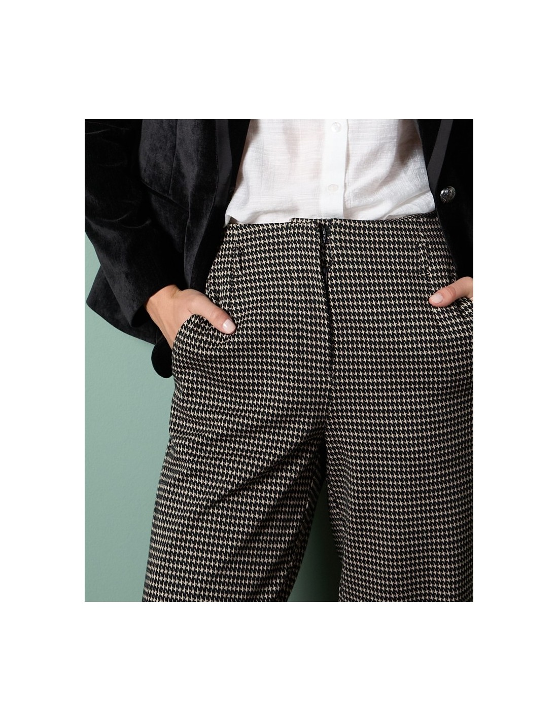 PANTALÓN RECTO Y ELÁSTICO EN PATA DE GALLO CON ESTAMPADO DE ESTILO BRITÁNICO, CIERRE FRONTAL Y CREMALLERA INVISIBLE